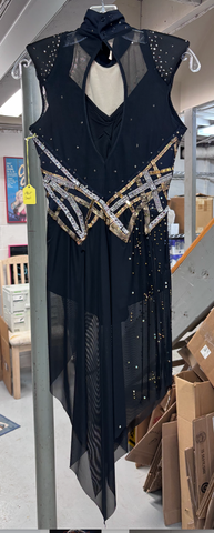 A pretty lycra dance length Black dress, embellished with gold and silver ribbons and crystals. Padded cap sleeves, asymmetrical mesh skirt that flows beautifully on the ice. Gently used and in excellent condition.